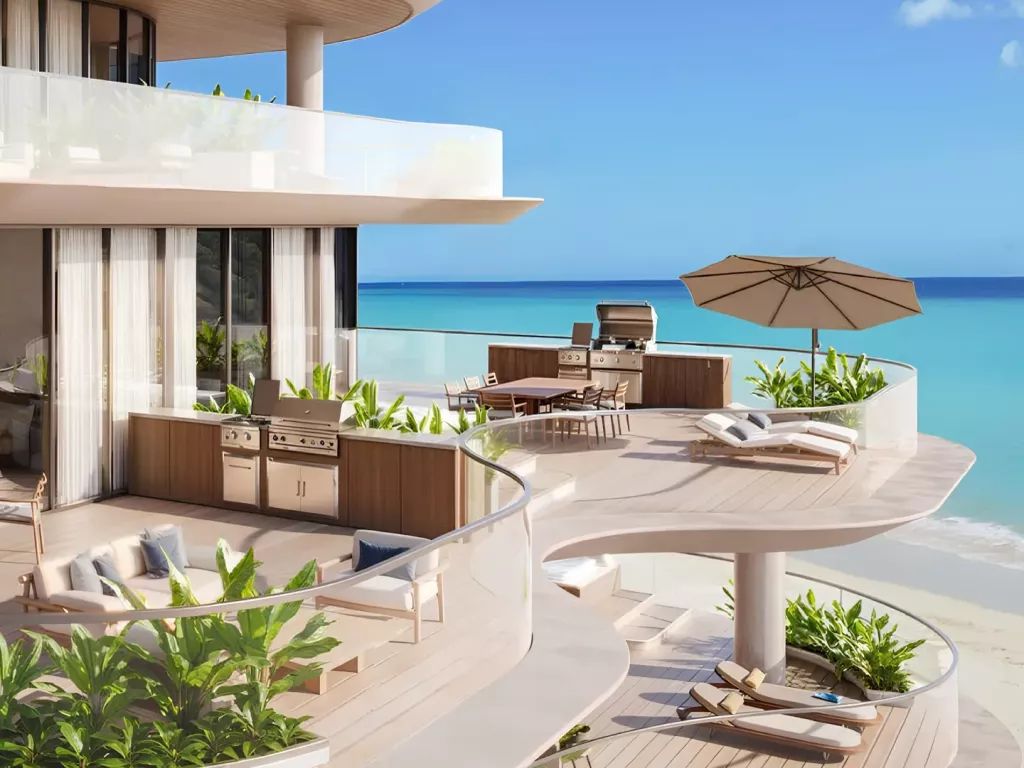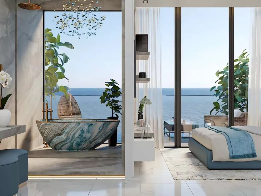 The complex offers studios and apartments with 1–2 bedrooms. The interiors are designed using high-quality materials in a light palette, and each residence is equipped with a fully fitted kitchen. Spacious balconies and large windows provide views of the bay and the island, filling the apartments with light and creating a seaside living atmosphere.