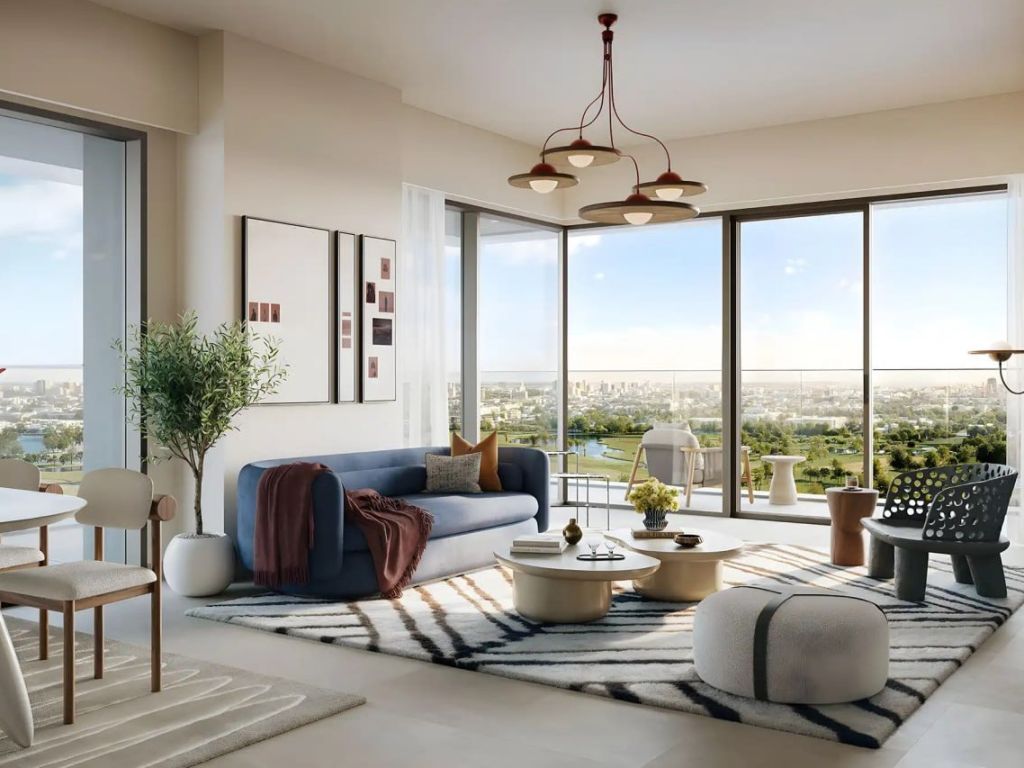 The location in the heart of Dubai Creek Harbour offers views of the canal, golf courses, and cityscape. Downtown Dubai is just 15 minutes by car, Dubai International Airport is about 20 minutes, and Al Maktoum International Airport is about 35 minutes.