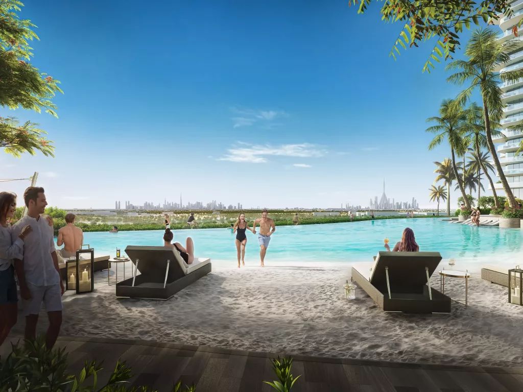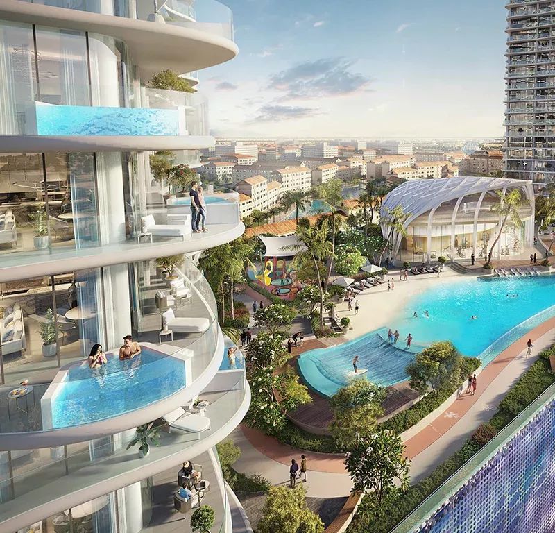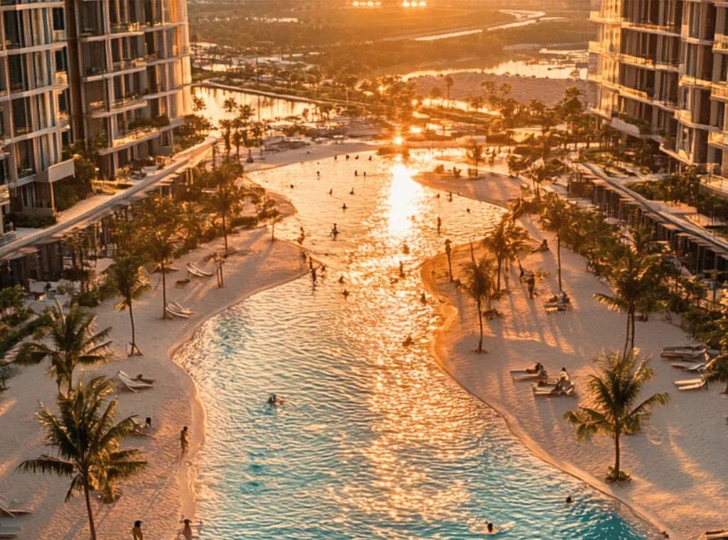The infrastructure includes over 30 amenities: a modern gym, yoga areas, multifunctional courts, a cinema, VR golf, as well as a large lagoon with a pool and water slides, creating a resort-style atmosphere.