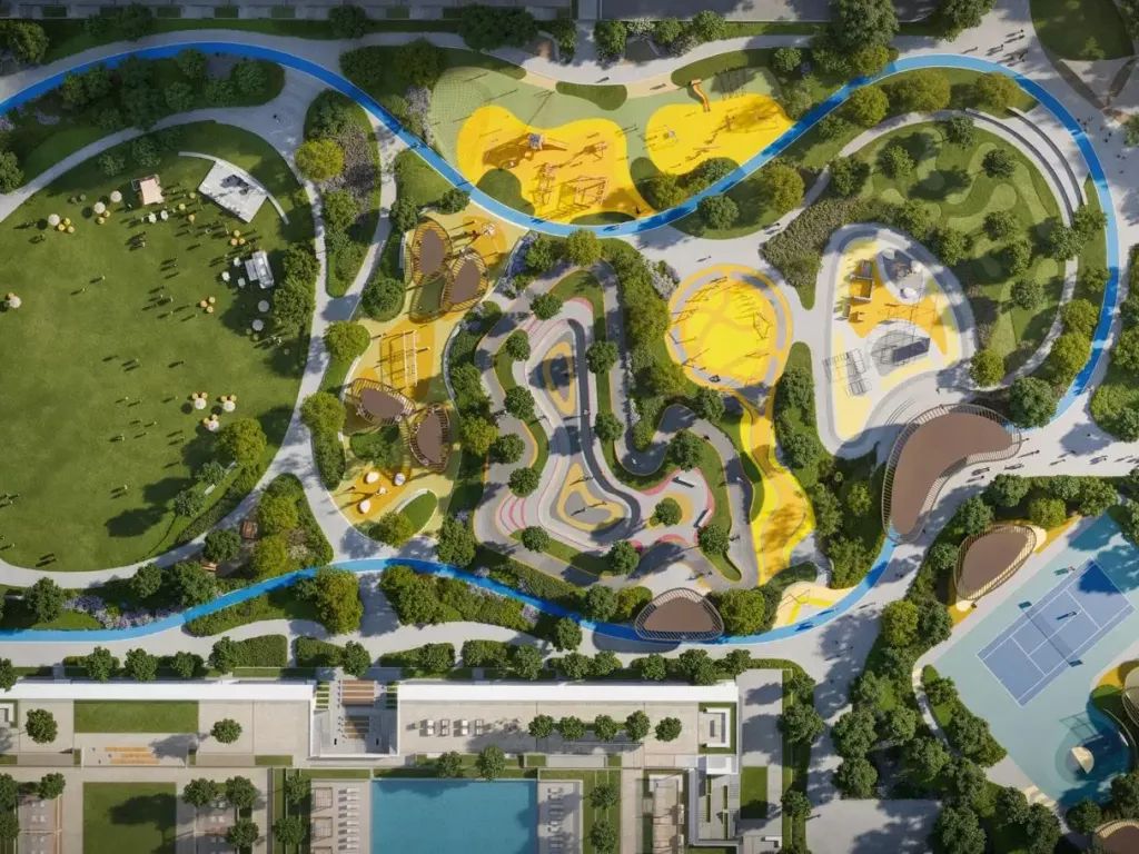 Residents have access to a wide range of amenities, including swimming pools, relaxation areas, an open-air cinema, sports courts, a yoga space, jogging tracks, and a skate park. All of this creates a comfortable environment for both active and peaceful lifestyles.