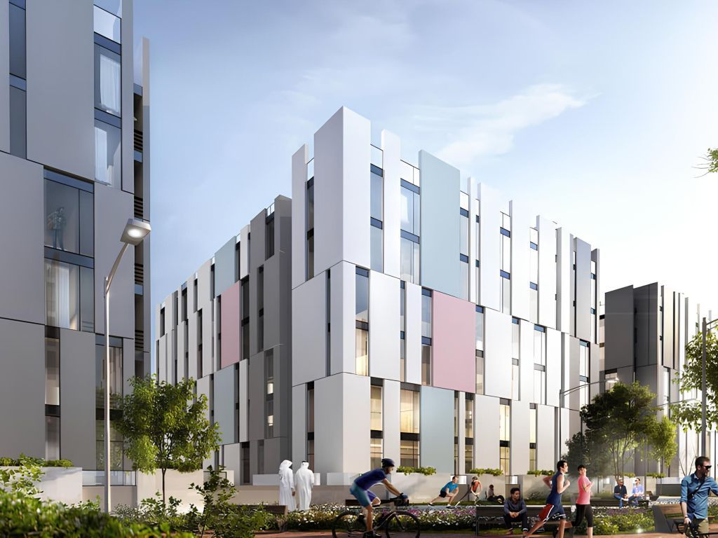 The Aljada Link complex consists of two underground parking levels, a spacious ground floor, and six residential floors. The sleek exterior design is complemented by bold vertical lines on the façade.