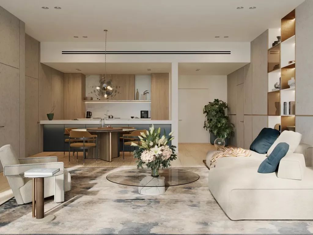 Le complexe propose des studios et des appartements de 1 à 3 chambres. Les intérieurs sont réalisés dans une palette claire et apaisante avec des matériaux naturels, notamment la pierre et le bois. Les fenêtres panoramiques du sol au plafond offrent des vues sur la mer et les couchers de soleil, tandis que les plans ouverts renforcent la sensation d’espace et de lumière.