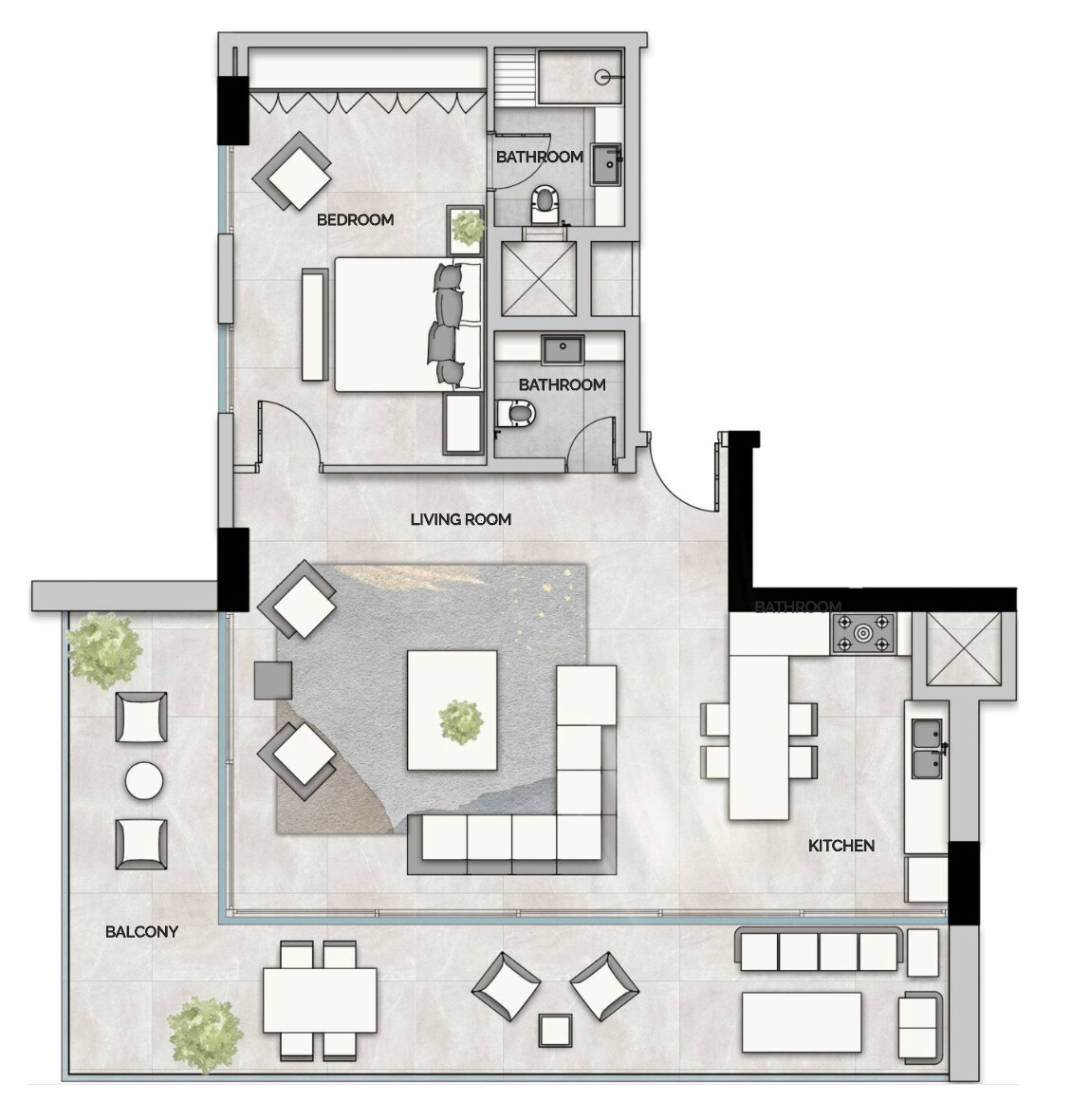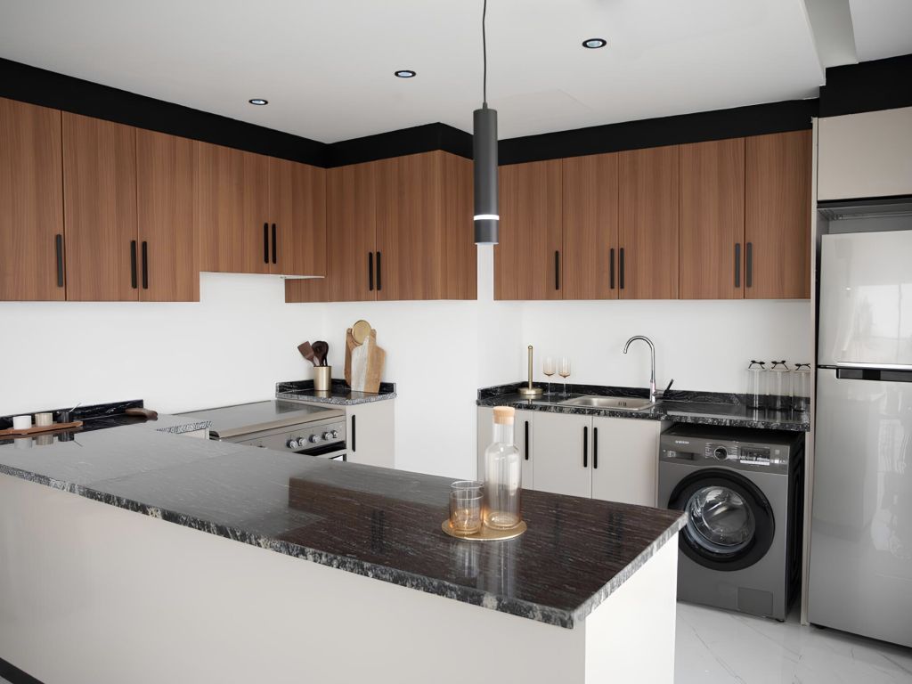 В проекте представлены студии, апартаменты с одной и двумя спальнями, а также трёхкомнатный пентхаус на верхнем этаже. Интерьеры выполнены в светлой цветовой гамме с использованием натурального дерева, что создаёт ощущение уюта и естественного тепла. Формат ориентирован на комфортное проживание в спокойной прибрежной локации.