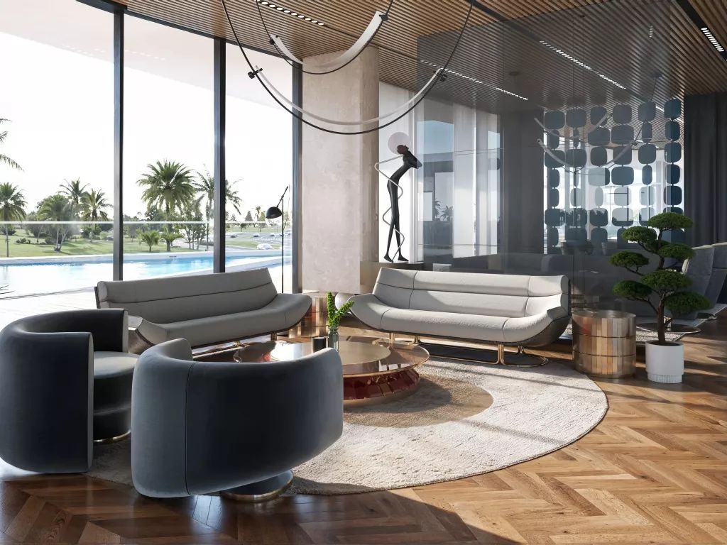 The complex offers studios as well as one- and two-bedroom apartments. The interiors are designed in collaboration with the Jacob & Co brand and are fully furnished with designer furniture and decorative elements. The spaces follow a modern luxury aesthetic with premium materials and carefully crafted details.